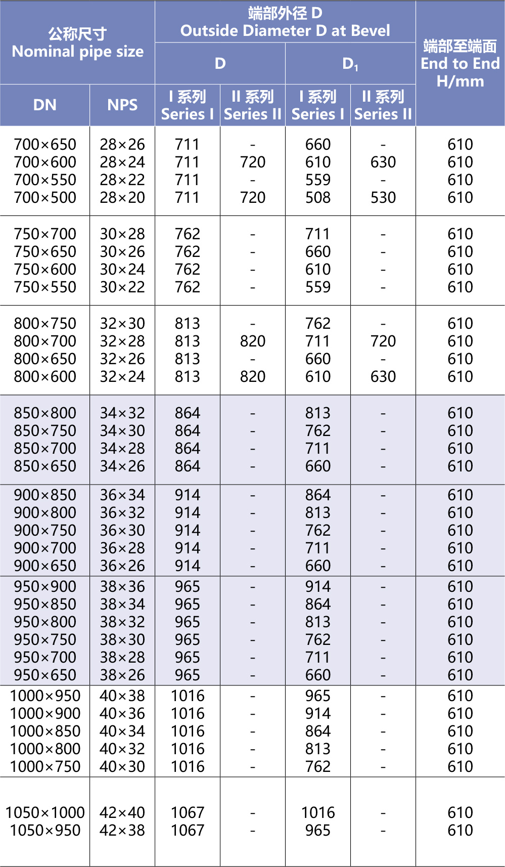異徑管的質(zhì)量應(yīng)符合現(xiàn)行國(guó)家標(biāo)準(zhǔn)《鋼制對(duì)焊無(wú)縫管件》GB/T12459-2005及《鋼板制對(duì)焊管件》GB/T13401-2005的規(guī)定,異徑管的圓度不應(yīng)大于相應(yīng)端外徑的1%,且允許偏差為±3mm;異徑管尺寸允許偏差應(yīng)符合表4.2.2-3的規(guī)定。異徑管的材質(zhì)執(zhí)行SY/T5037、GB/T9711、GB/T8163、美標(biāo)ASTMA106/A53GRB,API5L、APT5CT、ASTMA105、ASTMA234、ASTMA106、DIN德國(guó)標(biāo)準(zhǔn)及客戶要求標(biāo)準(zhǔn)。